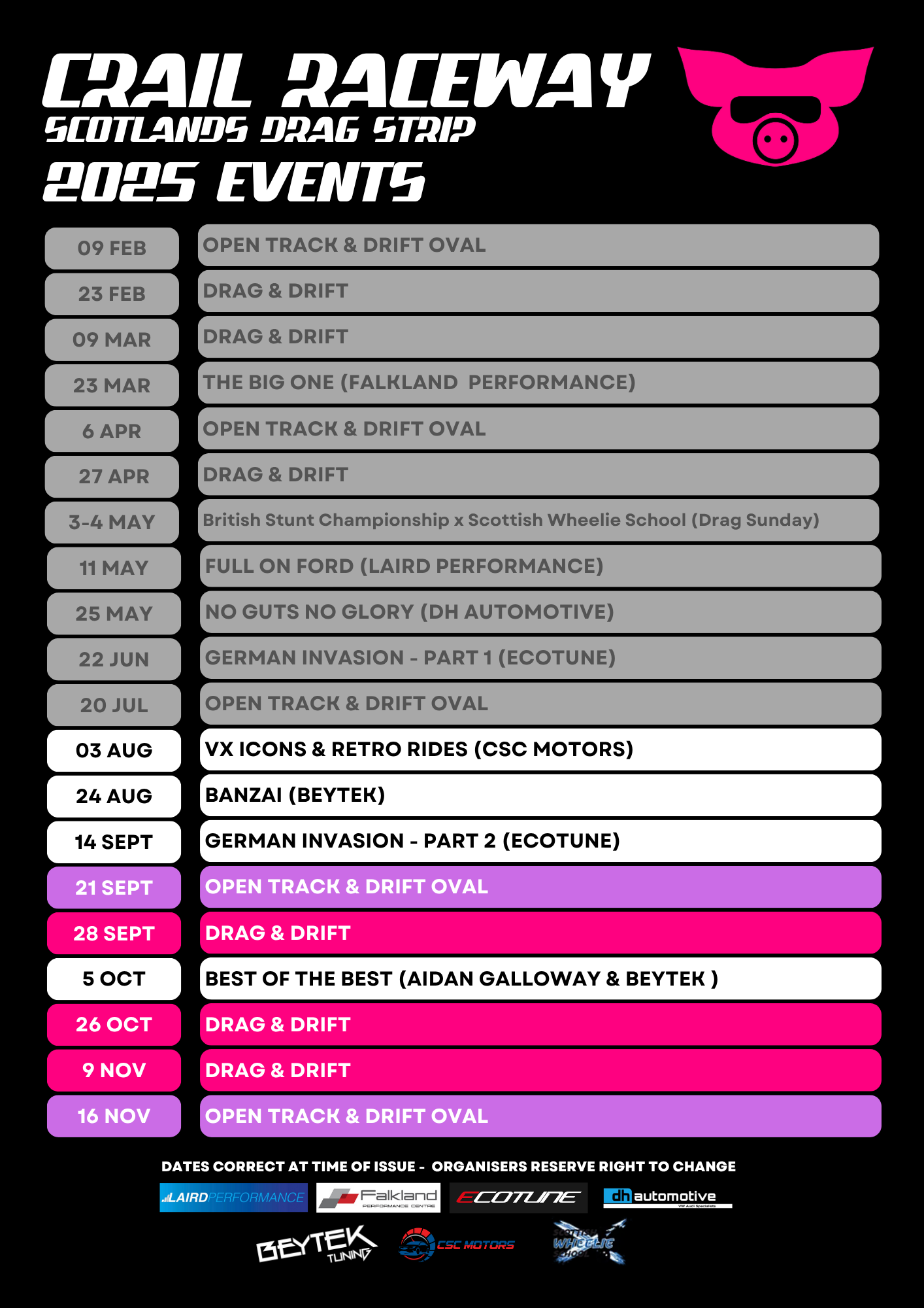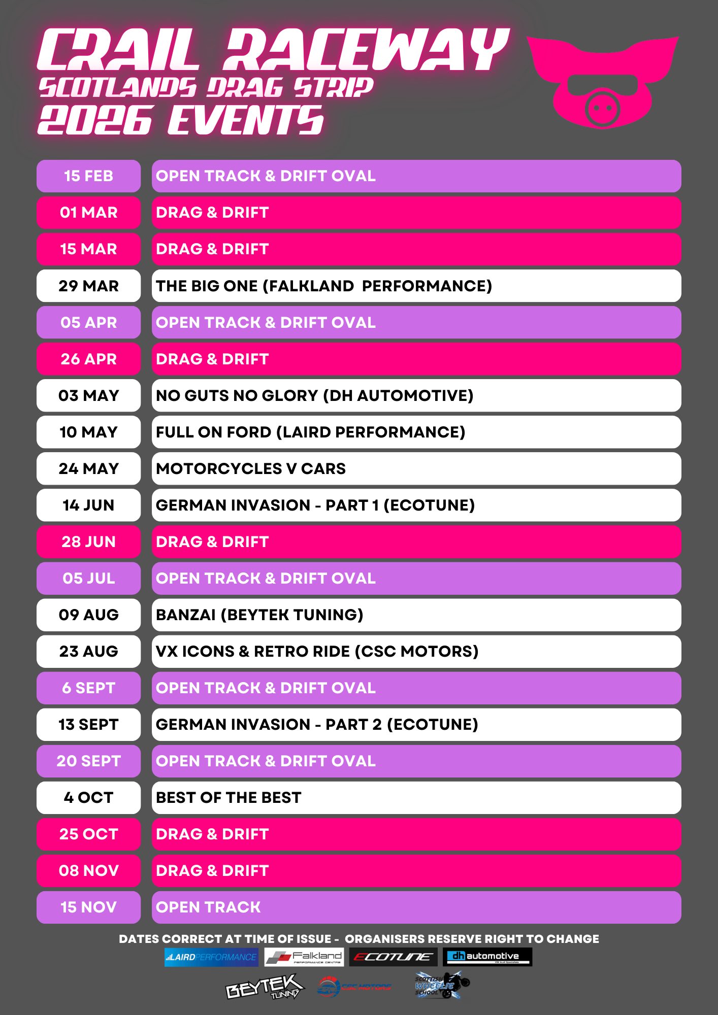 crail raceway operate Scotland’s only 1/4 mile drag strip with a new state of the art timing system, including full Christmas Trees (countdown start lights), computer and staging gear specially imported from USA from drag timing specialists Portatree (www.portatree.com).